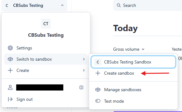 Top left you should have a menu like that. Notice my sandbox account? You'll need to create one as well. Then switch your API credentials, etc.. within your Stripe gateway to it. This allows you to do full testing. The documentation for this is below if you need further information. Including information on how to test (e.g. test credit cards).