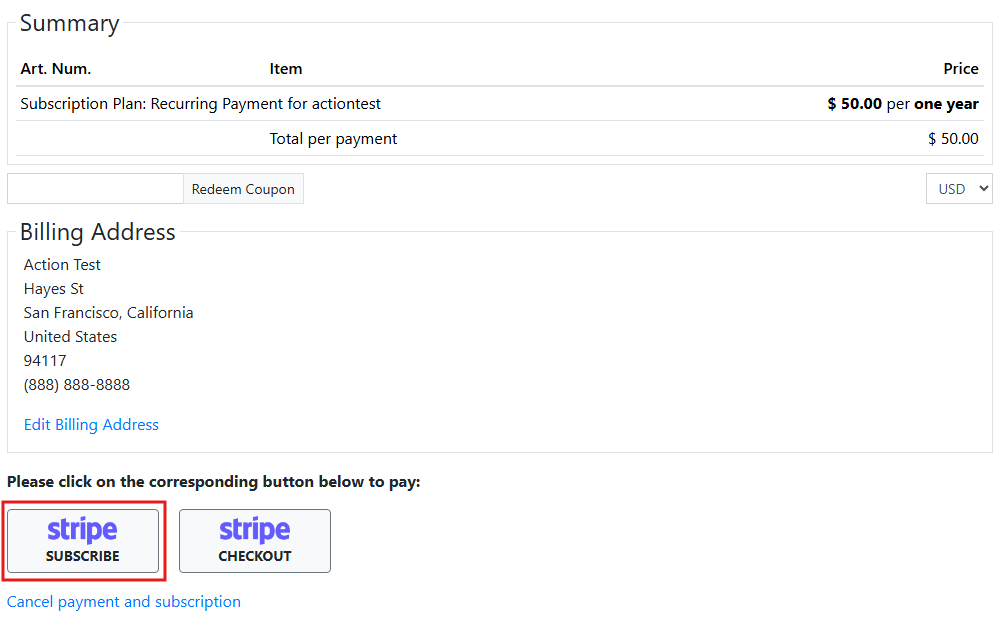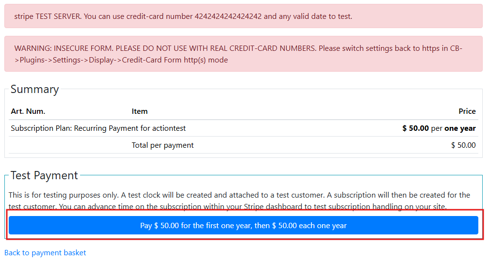 You cannot use test clocks with hosted checkout. Switch back to inline elements. Once you've done so when you go to subscribe the payment area where you normally input credit card details will just have a button to pay with a test clock. Test clocks don't immediately activate. They generate an invoice that is paid out and CBSubs will handle the webhook sent by that payment. So if you do not have webhooks properly configured CBSubs will never be notified of payments. Webhook configuration instructions are included in the CBSubs Stripe gateway configuration. You can then advance a test clock within your Stripe account to pass time on the subscription.