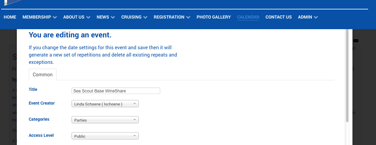 When I open an event to edit on the front end of the calendar, the pop up window appears but the top is hidden by the header and navigation. It is sometimes hard to get it to move down so that I can see and hit the save. How do I adjust that? I have tried to adjust the window size under Configurations / Event editing but that doesn't seem to change?