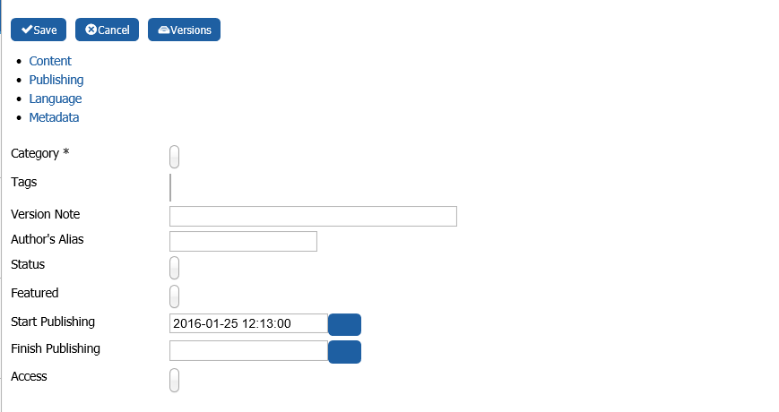 When editing an article on the front end of the site, if you click on the link for Publishing or Language, the dropdown selections are not viewed/displayed correctly. See Screenshot.