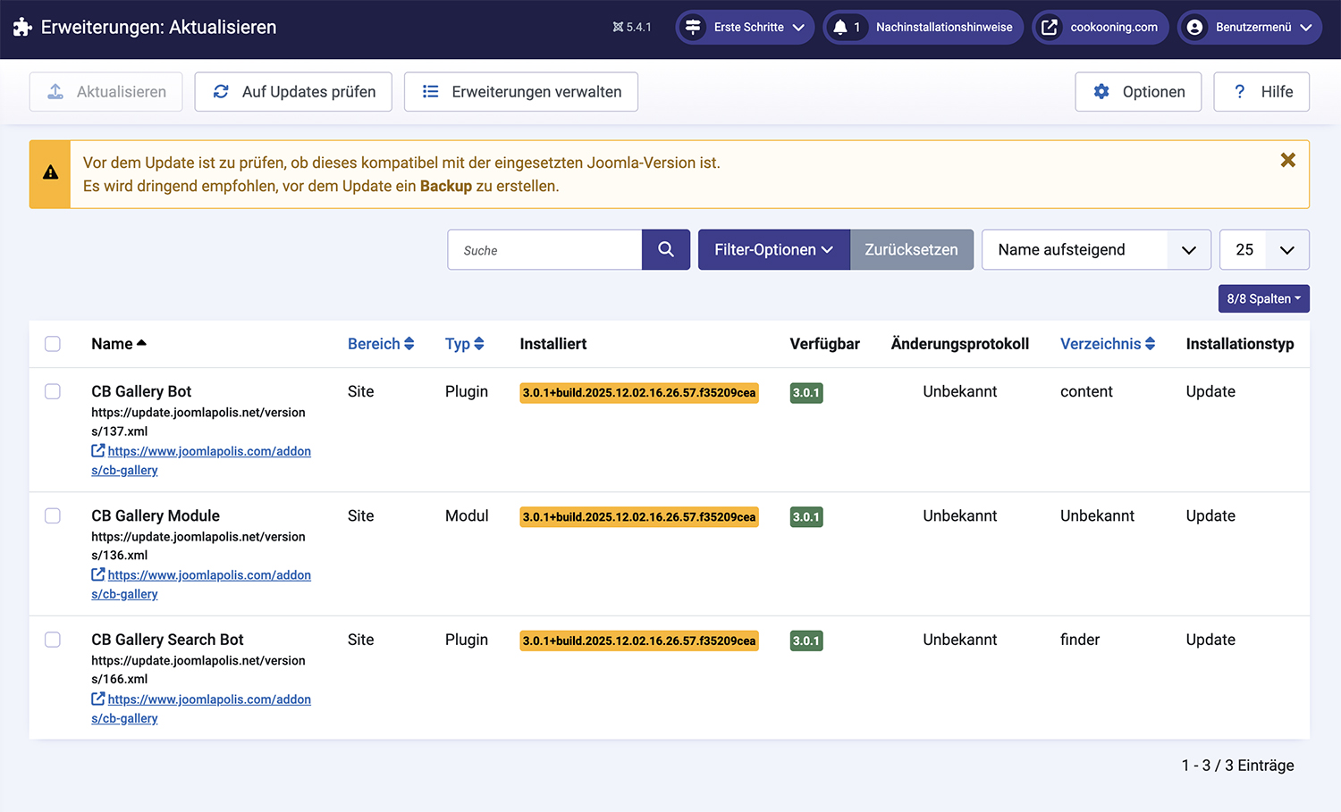 Hi, since about 2or 3 weeks I hav 3 entries for CB Gallery updates in the Joomla uptate section. Today I updated via CB to the newest version of CB Gallery, 3.0.1+build.2025.12.02.16.26.57.f35209cea, but the entries are still visible. Why?
