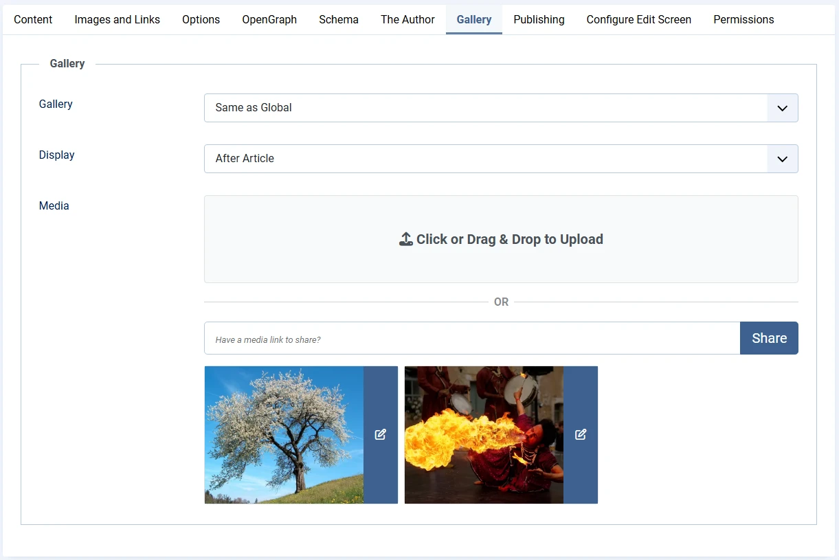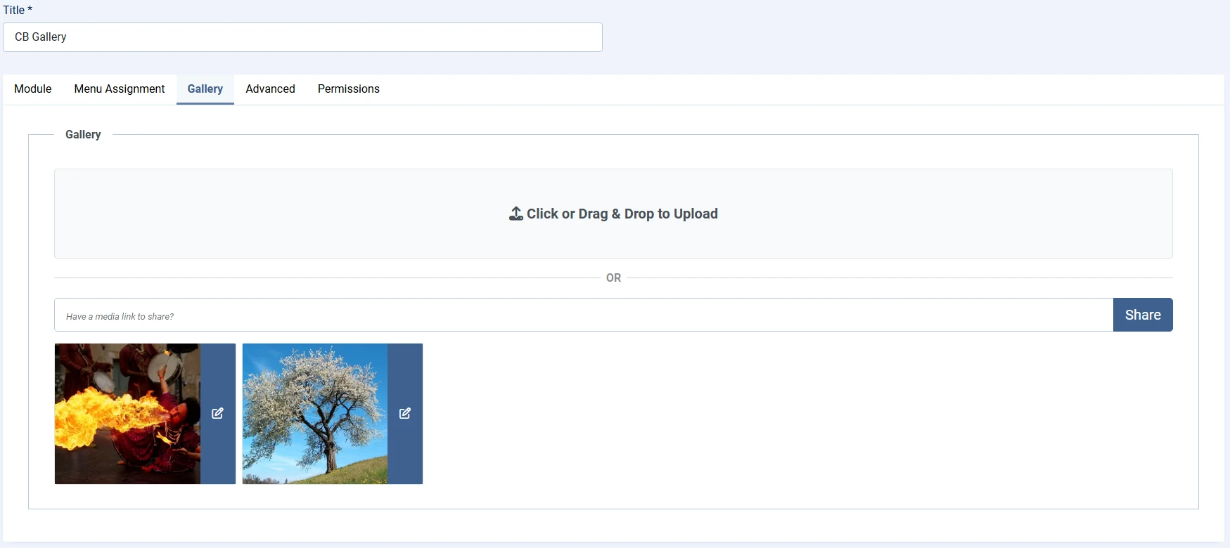 It's now possible to share media from backend module edit directly into galleries. This is convenient for module specific galleries for easy media management to avoid having to do so from frontend.