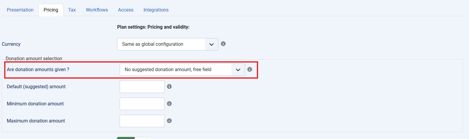 Finally under the Pricing tab of your new plan you configure how your donation pricing is handled