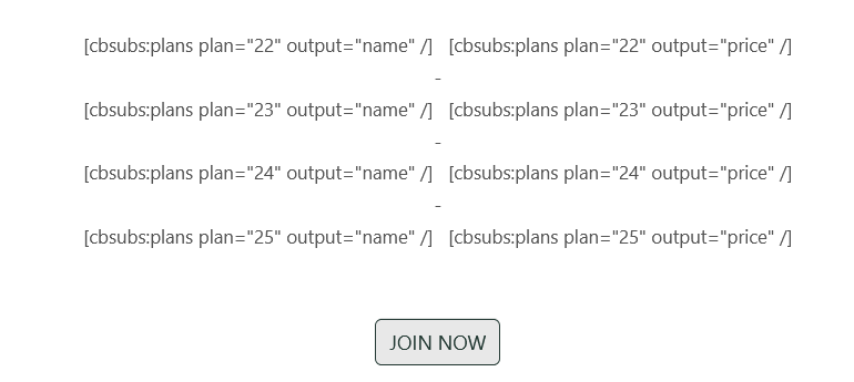 The membership page displays '[cbsubs:plans plan="22" output="name" /] [cbsubs:plans plan="22" output="price" /]' instead of the actual data