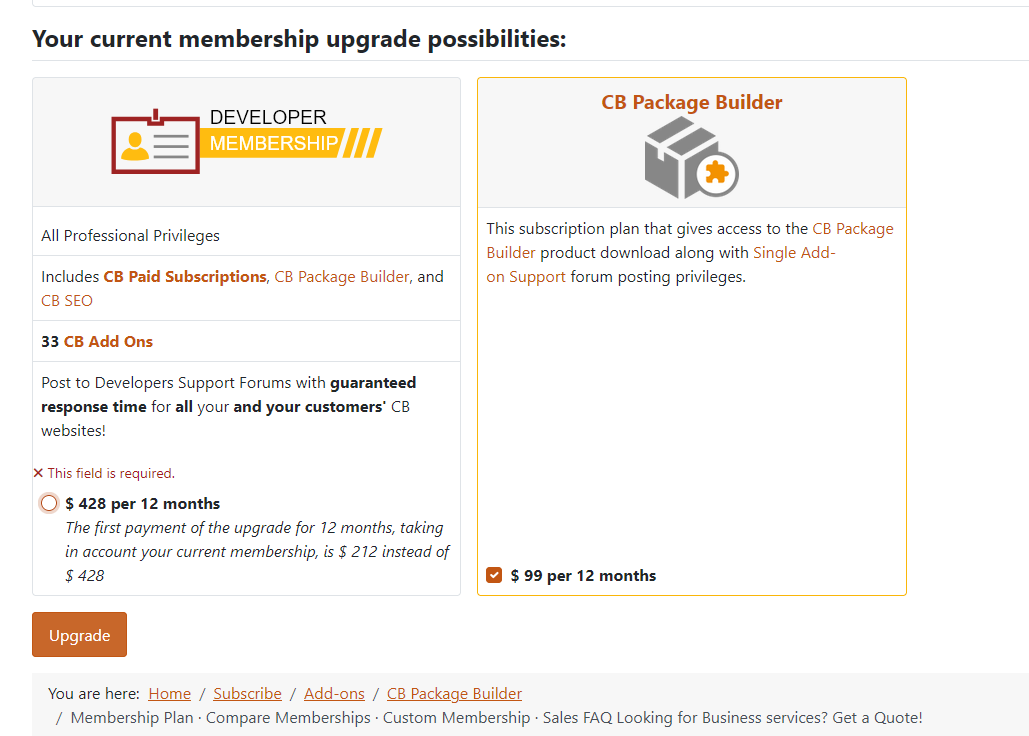 Ok, have improved the Buy button behavior for CB Package Builder. It will now take you right to the individual addon plan if logged in. Will work my way through improving the other buy button URLs as well. Sorry for the inconvenience.