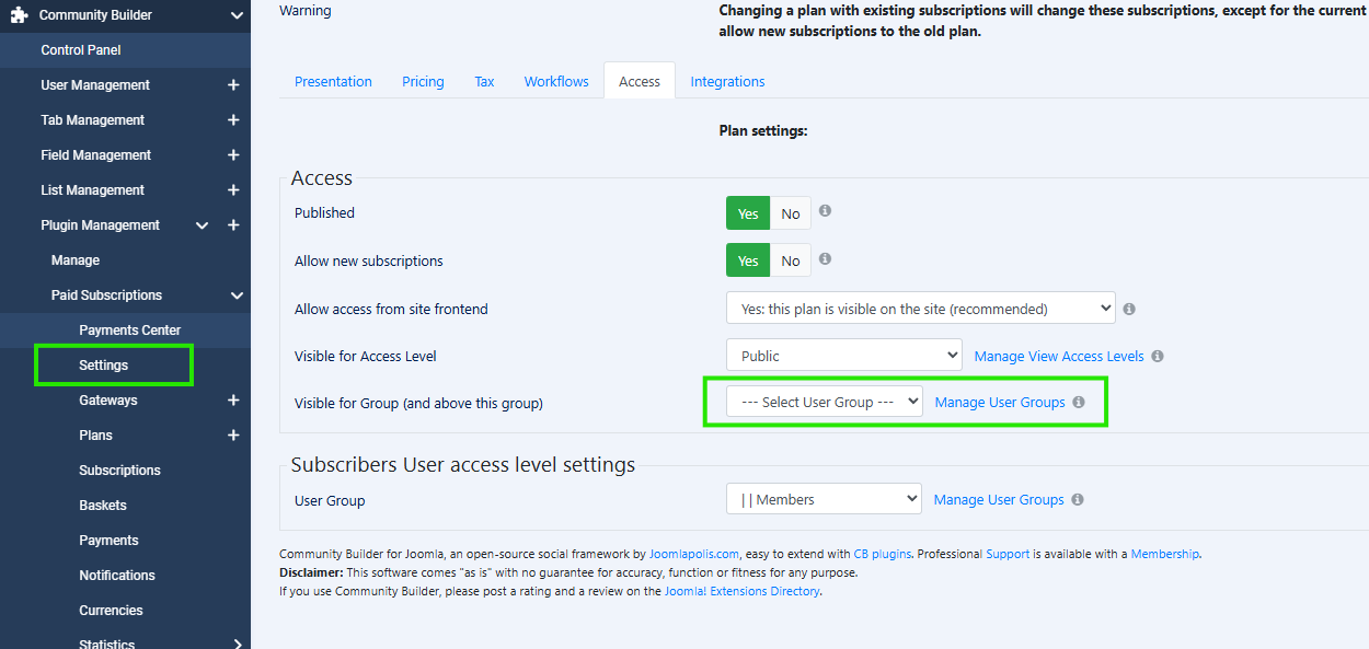 Both parameters are required, yes. Will review getting rid of the "- Select X -" option so it isn't implied it's optional.It appears that plans must be BOTH visible for access level AND visible for group in order to display. It would be helpful if that relationship were called out in the help "i" for each setting.