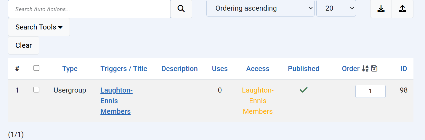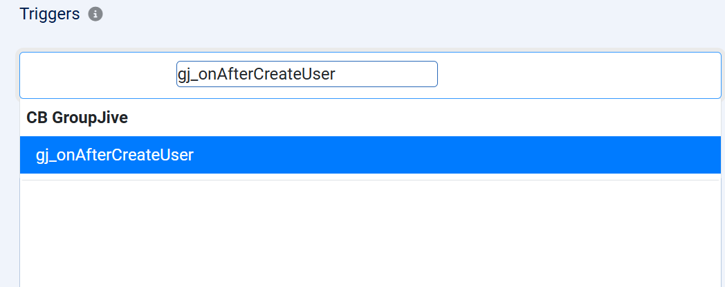 When creating a new Auto Action, I type a trigger name (e.g. `gj_onAfterCreateUser`) in the Triggers field. The dropdown appears and the correct trigger is highlighted in blue. However when I click on it or press Enter, the field resets to "None" and the trigger is not added as a tag.
